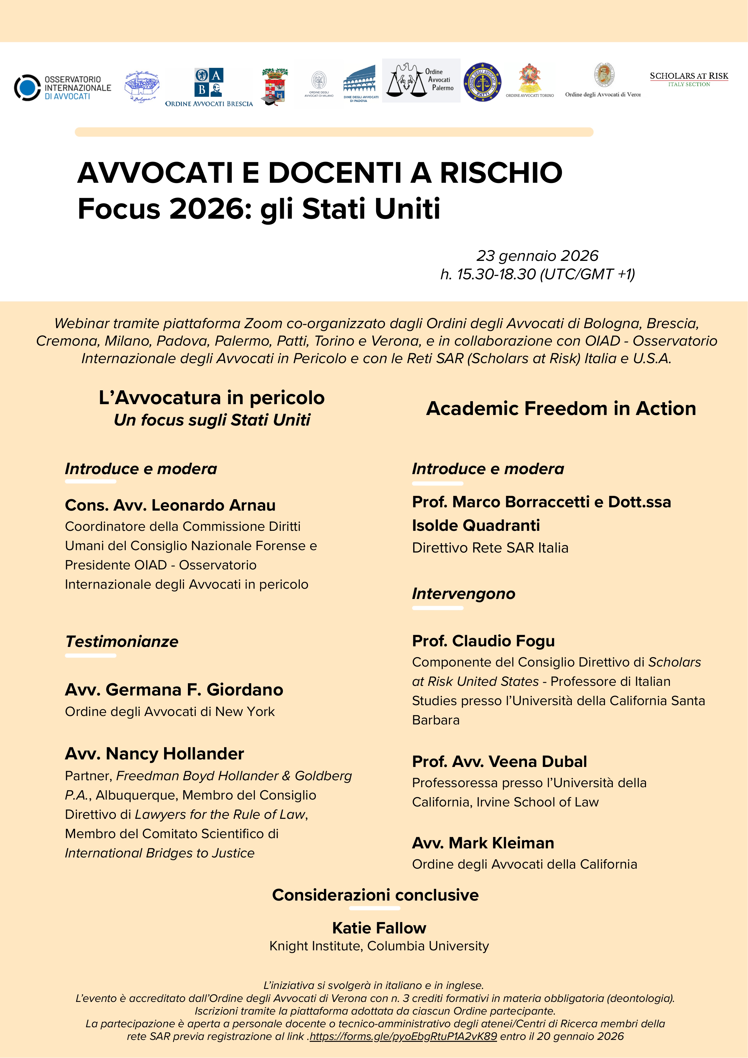 Giorno 23 gennaio 2026 h. 15.30-18.30 (UTC/GMT +1) avrà luogo il webinar Avvocati e docenti a rischio. Focus 2026: gli Stati Uniti.